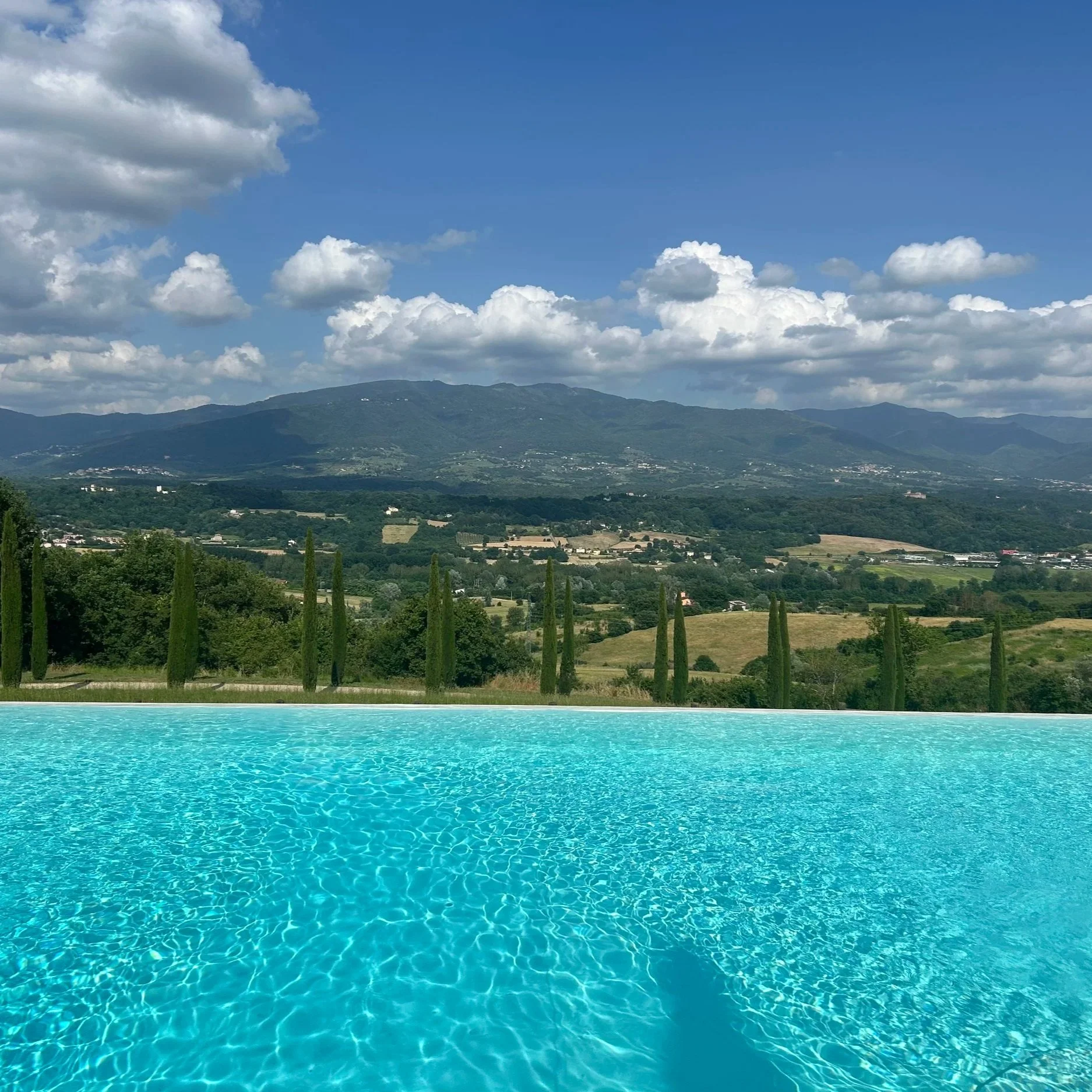 Leftovers from the night before became an easy lunch of carbonara and sandwiches, and by midday everyone migrated back to the pool under an 87° Tuscan sun. It was the kind of afternoon where time disappears, sunlight, water, sunscreen, and long conversations in between swims.